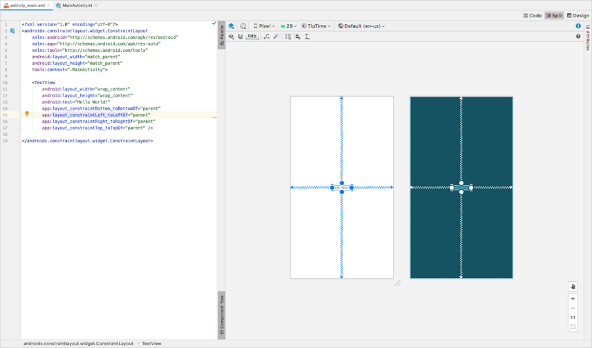 - 자주...사용하던 방식은 아니나 참 괜찮은 방식인 걸로 알고 있다. RelativeLayout에서 아쉬운 점을 보완하여 체인 스타일이라는 시스템이 존재하고 예를 들어 TextView 두 개를 중앙 정렬 공평하게 두 개로 둔다는 코드를 작성하면